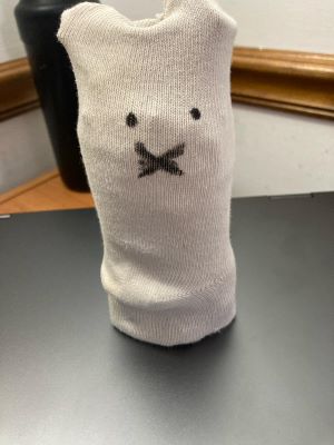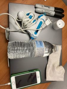 All you need is a plastic water bottle, LED candle or an old phone’s flashlight ,a sock, black paint or a black sharpie. You will also need Scissors and a glue gun.